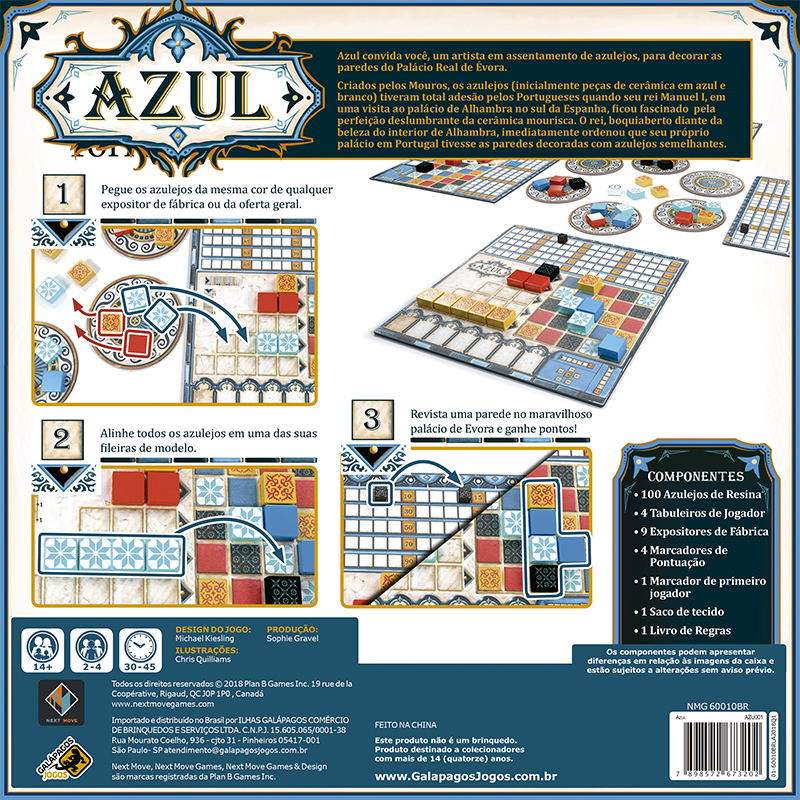 Azul foi concebido pelo famoso e premiado game designer Michael Kiesling. O jogo captura a bela estética da arte moura num jogo de tabuleiro contemporâneo. De 2 a 4 jogadores competem como artesãos, decorando as paredes do Palácio Real de Evora. Escolhendo com cuidado a quantidade e estilo corretos de azulejos, os artesãos mais astutos planejam suas paredes para maximizar a beleza de seu trabalho (sem contar suas pontuações!), enquanto tentam garantir que nenhum recurso seja perdido no processo.