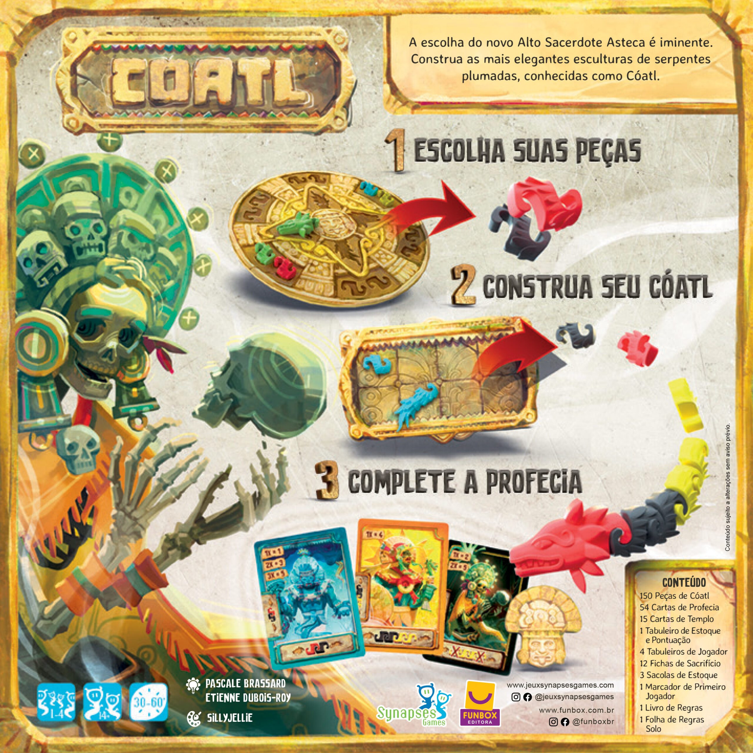 Chegou a hora de escolher o novo Alto Sacerdote Asteca. Para provar seu mérito, os candidatos participam de um torneio de grande prestígio para impressionar os deuses. Construa as mais elegantes e mirabolantes esculturas de Cóatl (A Serpente Plumada) para conquistar a vitória e o cobiçado título de Alto Sacerdote Asteca.
