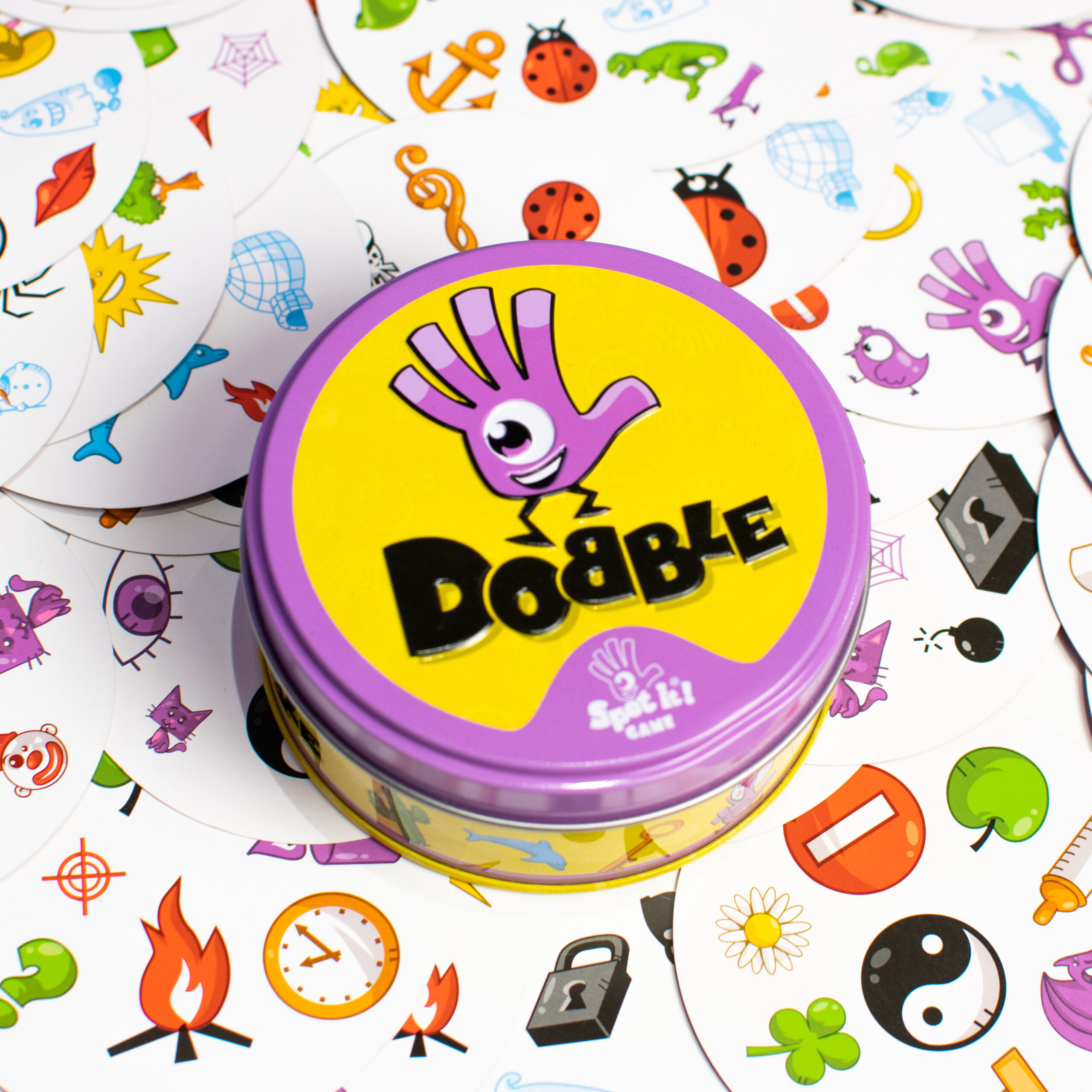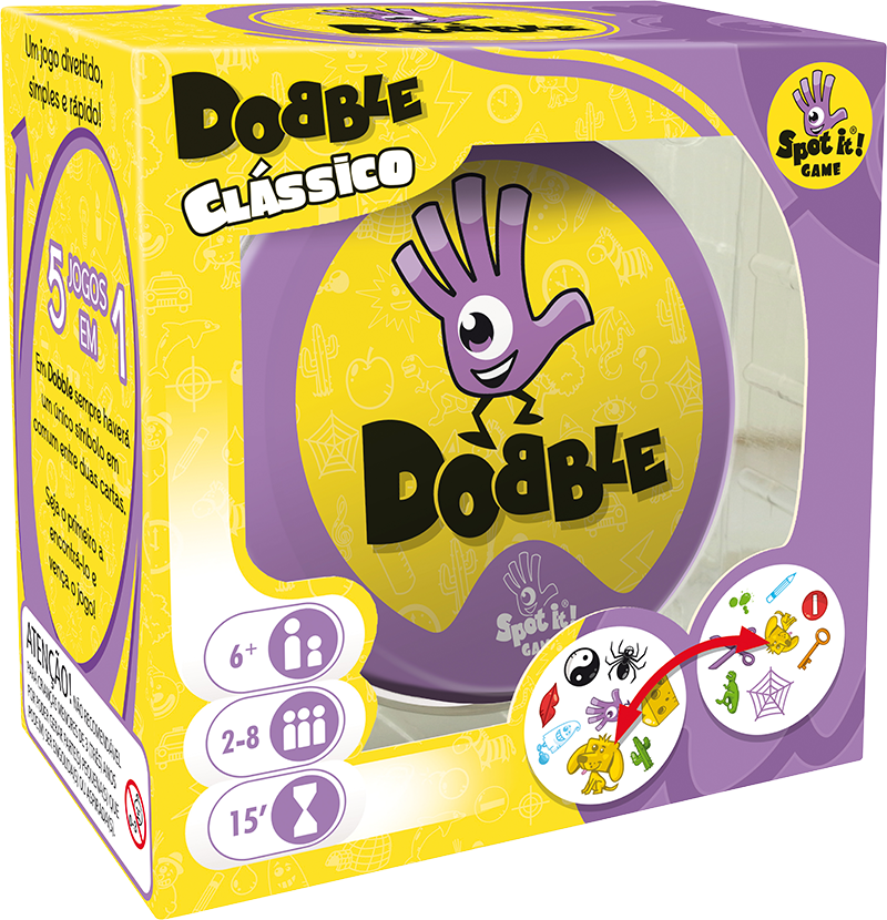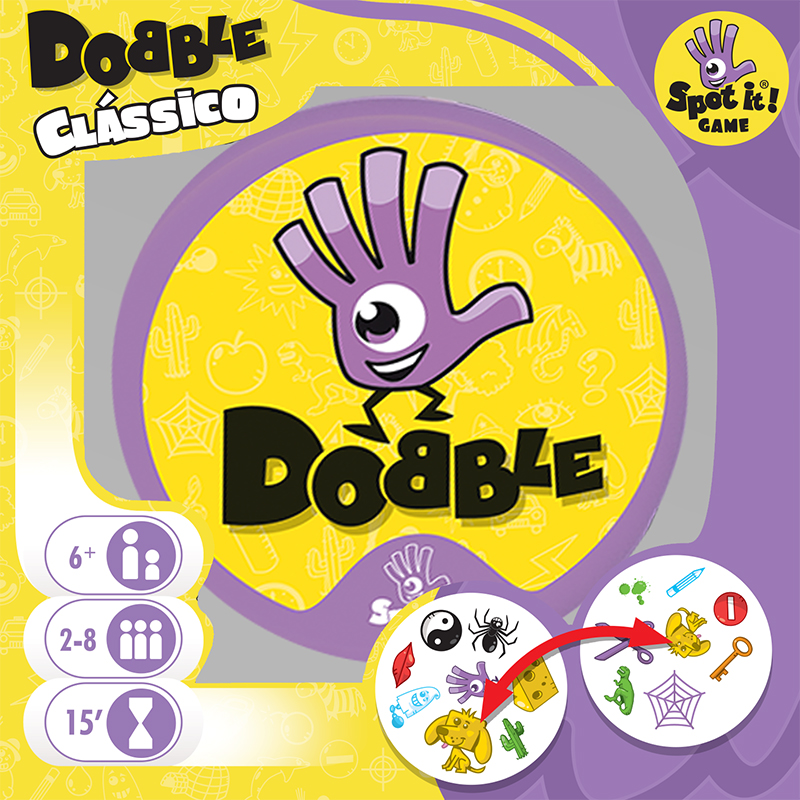 Dobble é um jogo de sucesso mundial, um verdadeiro desafio de velocidade e observação no qual todos jogam ao mesmo tempo! O objetivo é conseguir identificar qual é o símbolo em comum entre duas cartas – e cada carta tem somente um símbolo em comum com qualquer outra carta do baralho. Todos os participantes têm a mesma chance de ganhar a rodada, por isso é preciso ser ágil!