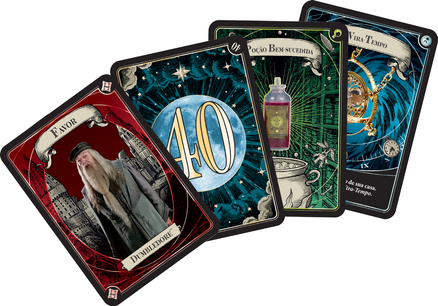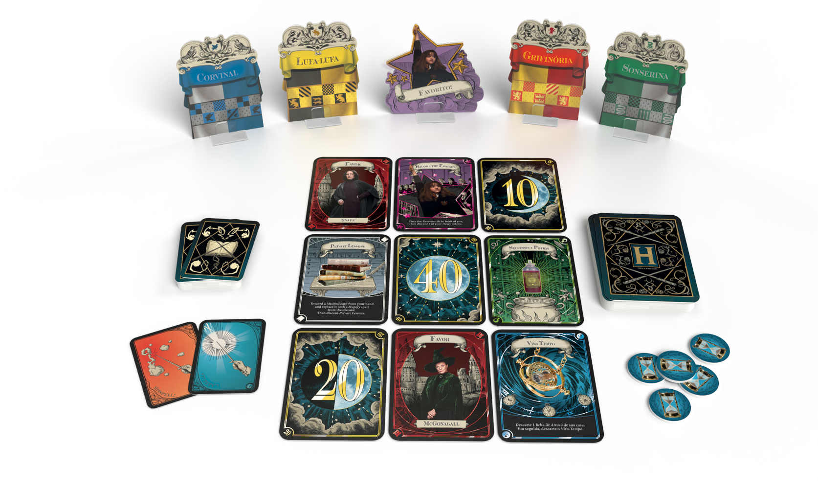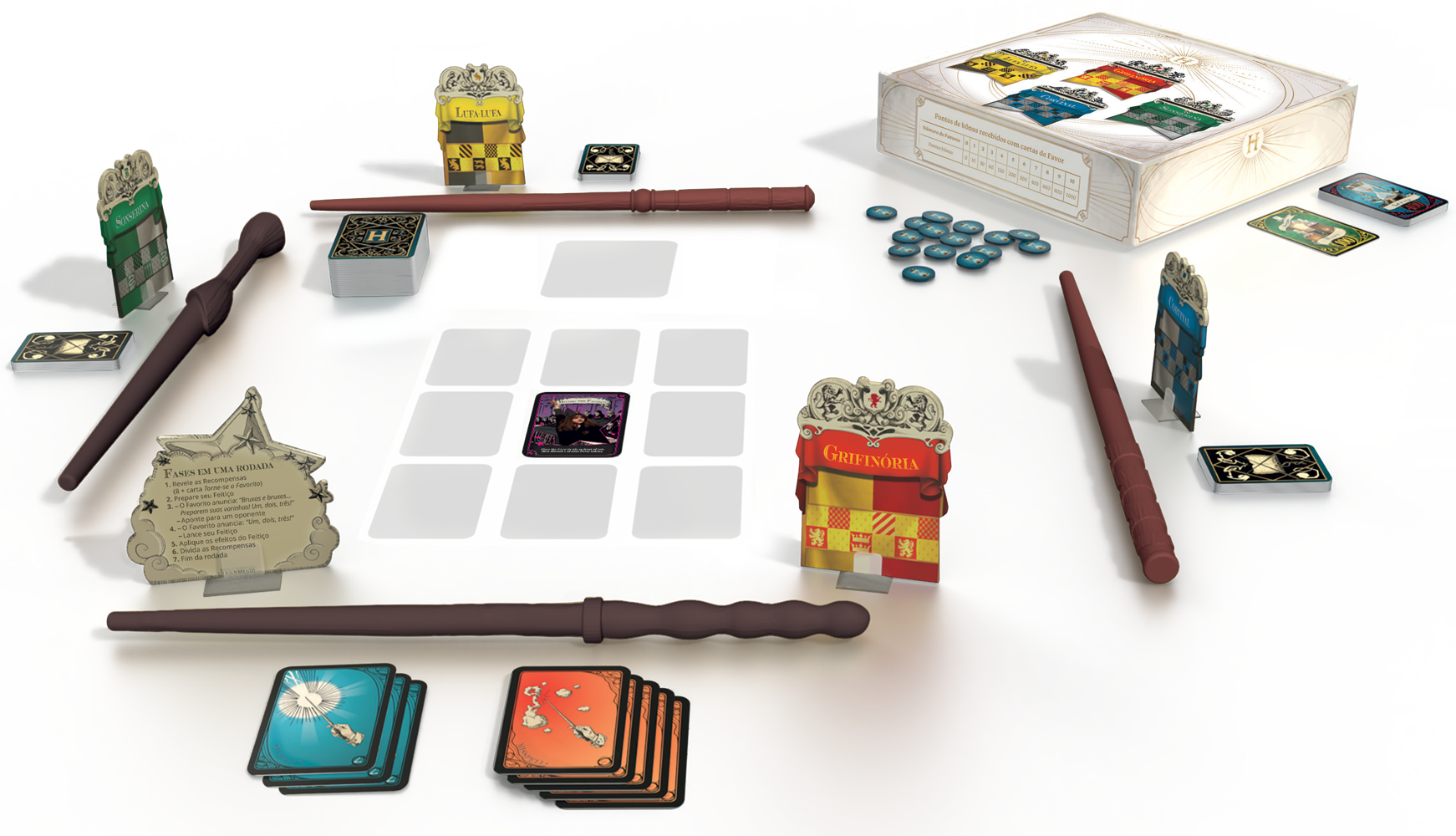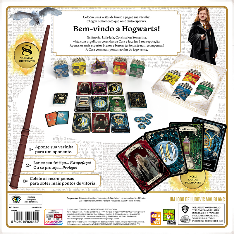 Jogue com seus amigos representado uma das 4 casas de Hogwarts! Entre blefes e sorte, o objetivo da partida é simples: acumular o máximo de pontos possível pra sua casa por meio de recompensas de duelos bruxos, disputadas ao longo de 8 rodadas.