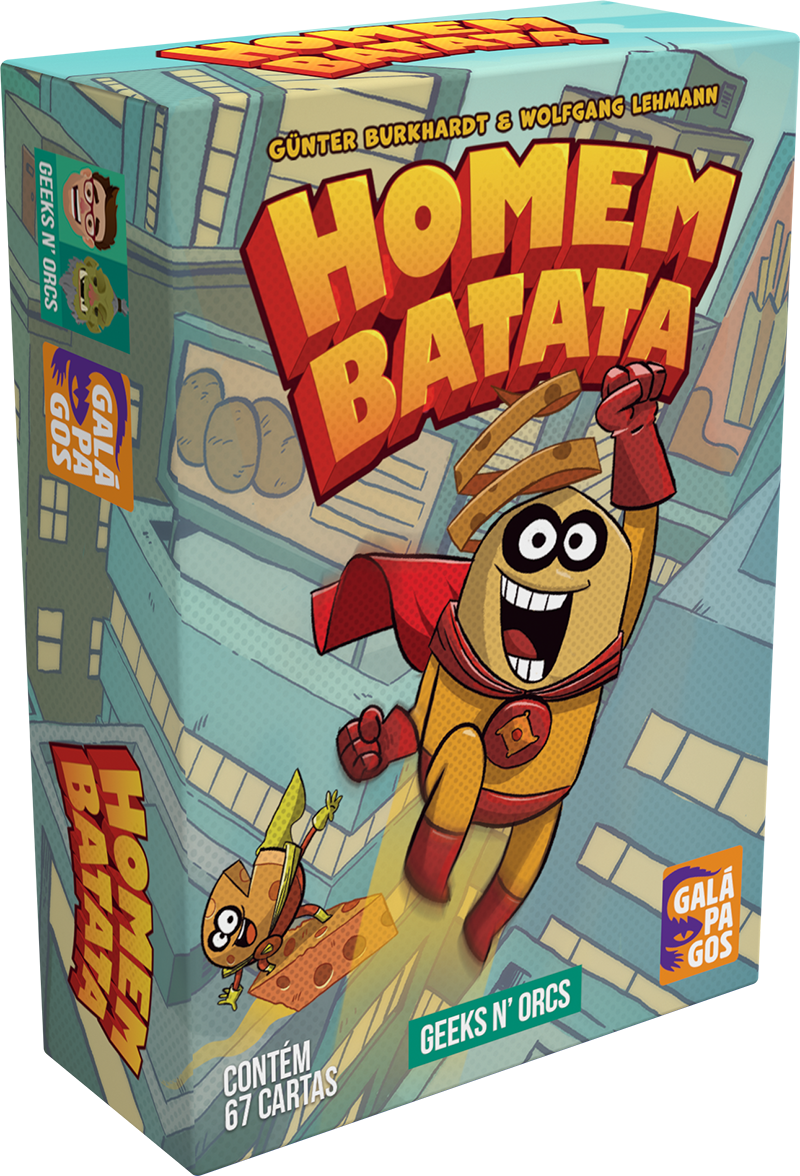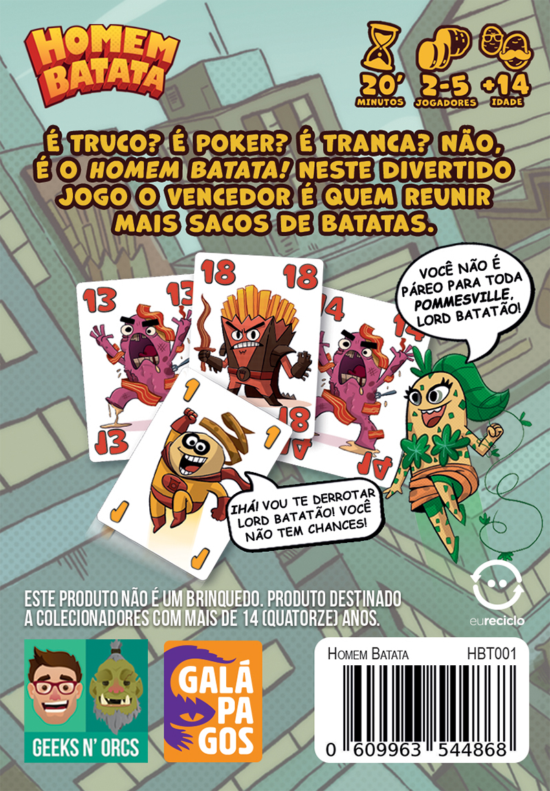Mas se você está perdendo a rodada, não tema! Pois o Homem Batata, uma das menores batatas nesse baralho, derrota o Lord Batatão – a batata mais forte do baralho! Além disso, o jogo conta com arte e temática cômica, para trazer diversão e leveza (e talvez um pouco de fome) pro seu rolê!