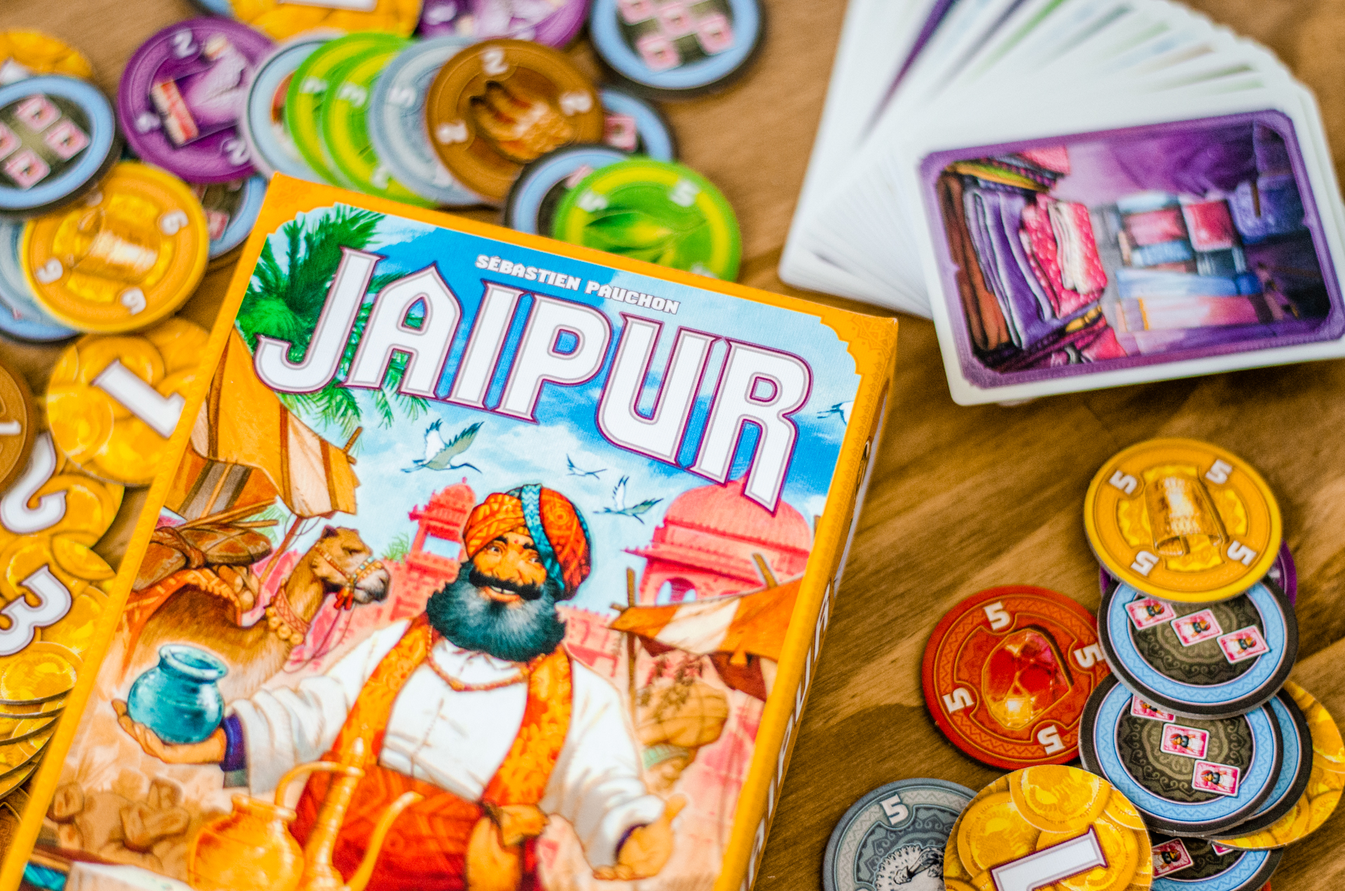 Jaipur é um jogo de cartas de ritmo rápido que combina tática, risco e sorte em um duelo eletrizante! No seu turno, você pode pegar ou vender cartas da sua mão. Se você escolher pegar cartas da mesa, pode optar entre pegar todos os camelos, pegar uma carta de mercadoria ou trocar de 2 a 5 cartas que estão na sua mão com as cartas do mercado.