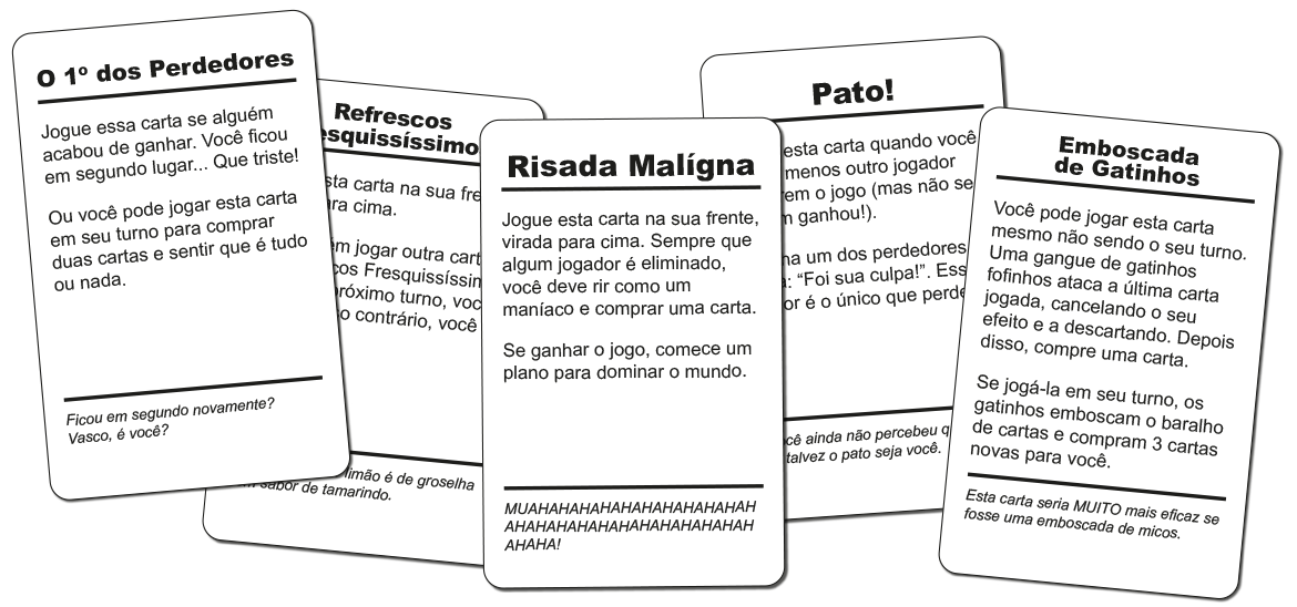 – Todos compram duas cartas. Na sua vez, compre outra carta e escolha uma delas pra jogar, seguindo o que a carta escolhida manda você fazer.