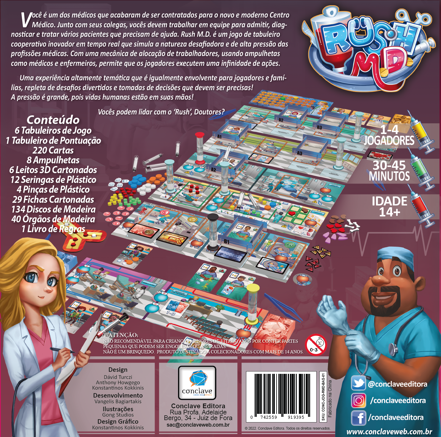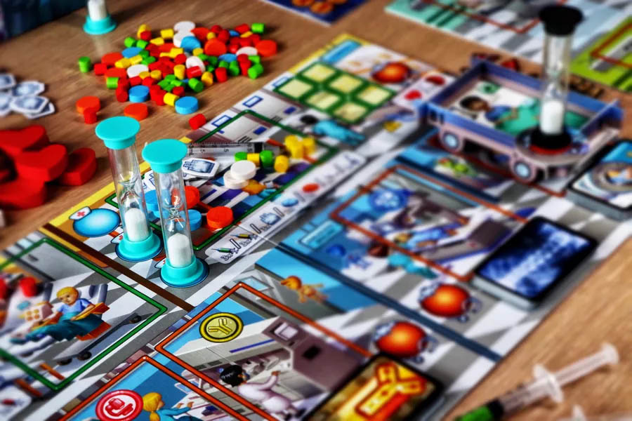 Você é um dos médicos que acabaram de ser contratados para o novo e moderno Centro Médico. Junto com seus colegas, vocês devem trabalhar em equipe para admitir, diagnosticar e tratar vários pacientes que precisam de ajuda. Rush M.D. é um jogo de tabuleiro cooperativo inovador em tempo real que simula a natureza desafiadora e de alta pressão das profissões médicas. Com uma mecânica de alocação de trabalhadores, usando ampulhetas como médicos e enfermeiros, permite que os jogadores executem uma infinidade de ações.